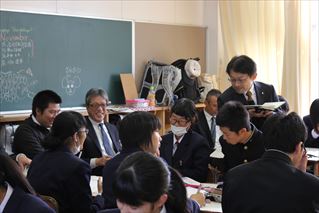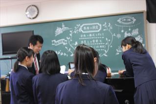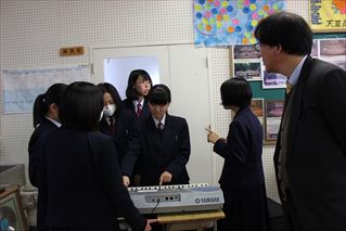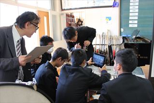 30名を越える熊本県下の音楽の先生方の参観の中でも、いつも通りに楽しそうな2年音楽選択者。吹奏楽部や合唱部経験者も多いため、各班で音の表現に工夫を凝らす姿がみられました。