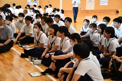 ↓ 班の前方にいる2名が3年生、班でまとまって話を聞いているのが2年生です。実りある交流会になりました!
