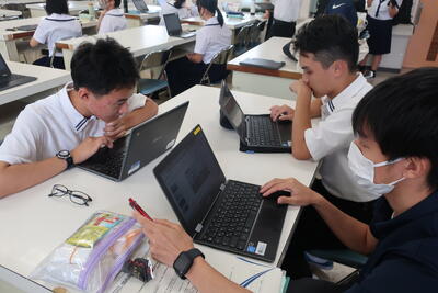The third-year students, who began their activities in the seventh period, were all writing papers with their chromebooks. The deadline is coming up at the end of this month, and everyone is working really hard. We hope they can produce a good paper that summarizes their research!
