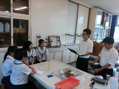 さて、地学室では、久々にヘドロ入りバケツを手にした「汽水域班」を発見しました。採取直後に測ったBOD(生物化学的酸素要求量)と、採取して1週間たったヘドロのBODを比較することで、微生物の代謝活動を調べているそうです。その後ろには、「魚糞班」が金魚の水槽から魚糞を採取しているのが見えます。また、2年生に混じって「農業班」の3年生の姿が! 2年生の生徒にアドバイスしているようです(頼もしい!)。