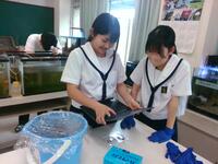 Now, in the Earth Science room, we found the “Brackish water group” with a bucket of sludge in their hands! They are studying the metabolic activity of microorganisms by comparing the BOD (Biochemical Oxygen Demand) measured immediately after collection of the sludge and the BOD after one week. Behind them, the group “Fish Waste” can be seen collecting fish waste from a goldfish tank. Also, among the second-year students is a third-year student from the “Agriculture” group! He seems to be advising the second-year students - how nice!