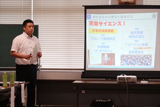 本校の場合は、熊本大学理学部及び教育学部、崇城大学工学部、長崎大学水産学部、鹿児島大学農学部、天草市役所、DENSO、熊本日日新聞社、熊本県立教育センターの学部長様や教授の方々などの9名で構成されています。
