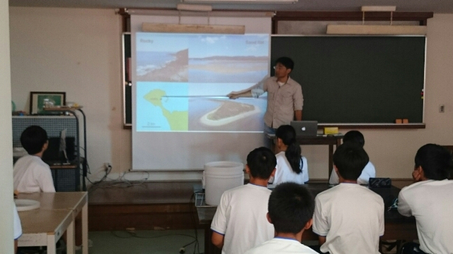 天草の沿岸が特殊な地形であり生態系の分布も多種多様であることや、天草の海とインドネシアの海を実際に映した動画を見ながら温帯と熱帯の特徴について教えていただきました。