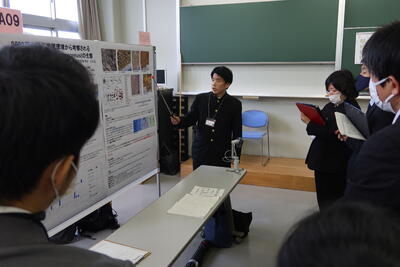 大きな会場でのポスター発表は初めての生徒も多く、最初はお客さんがくるのをただ待っている生徒も多かったのですが、少しずつ、自分から声をかけて発表を聴いてもらったり、聴いている人の顔を見て発表をしたりできるようにになってきました。他校の発表を積極的に聞きに行って質問もできた生徒も多く、今後の研究のヒントを得ることができました。また、発表に関して、ポスターへの工夫の必要性や発表時に実物を見せたり、聴衆の様子を観察しながら臨機応変に発表することの必要性を学んだりと、多くの学びが得られた1日となりました。