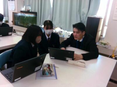 再来週の本評価を控えた2年生、今日のATⅠでは実験やアンケートの結果を分析している班が多かったようです。その中で困っていた ある班を発見しました。天草特産のみかんを活かした特産品を開発すべく、先日試作品の調理を行ったものの、本評価で示せる数値データがありません。調理の際、数値を取らなかったのか尋ねてみたところ、「バタバタして記録を取っていません」とのこと...。