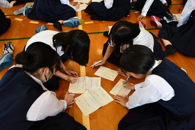 前回とは違う並び方、班編制にドキドキの生徒たち・・・。自己紹介やグループワークでは、いつもよりも先輩らしい2年生の姿も見られ、学年を跨いで交流する良い機会になりました。