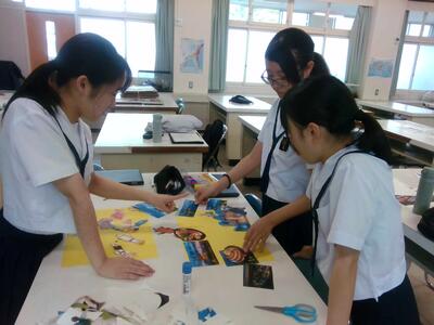 芸術の秋! 2年生の生徒数名がせっせとコラージュをしています。外国の美しい建物の写真もあれば、神社の写真もあり、美味しそうなウインナーの写真と海鮮丼の写真がコラボ…