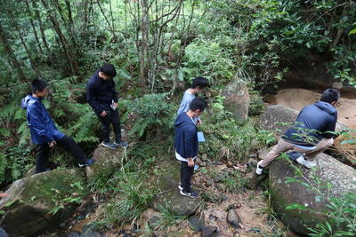 白嶽湿地での実習、講話の後はいよいよ公園内の探索です。スタッフの皆様にご案内いただきながら、白嶽湿地での生態系の観察を行います。今回は送迎にご協力いただいた保護者の方々にもご参加いただき、とてもアットホームな観察会となりました。生徒たちはSSH主任の宮﨑先生と、どのような点に着目して観察を行うべきかについてディスカッションを交えながら公園内を探索し、生徒同士で知識を共有しながら、それぞれ記録を残していました。約1時間かけて、公園内に生息するシダ植物をはじめとした様々な植物や、イモリや小魚などの生物が住む小川、いのししの通った跡やきれいな水の流れる滝など、様々な場所をじっくり観察することができました。