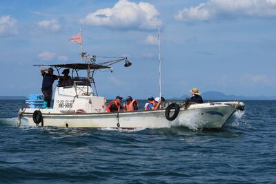 調査では天草市、天草漁協、漁業者の方々と協力し、漁船から採泥と採水を実施しました。
