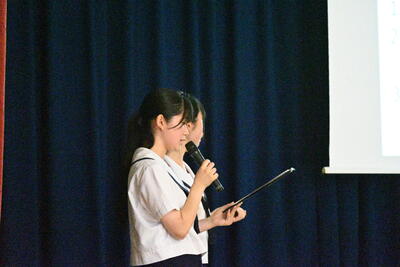 終業式後、科学部ホタル班が英語でのプレゼンテーションを全校生徒の前で行いました。世界大会での発表に向けて、これまで英語での発表練習を重ねてきました。貴重な日本のゲンジボタルについて海外の方々に知っていただくために、単に日本語を英語化するだけではなく、より伝わりやすい表現やスライドを工夫しています。英語でのプレゼンテーションならではの難しさもありますが、残りの時間で更に完成度を高め、自分たちのできるベストの発表をしてきてほしいと思います。