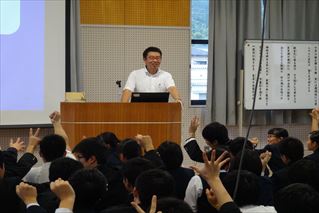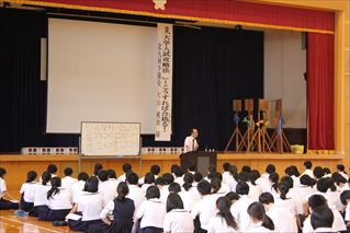 体育館では、「大学入試攻略法 こうすれば合格(うか)る」!と題して北九州予備校の大山純治さまをお迎えし講演会を実施しました。