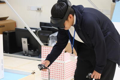 Today's training began with a session on motion capture systems. This is a technology that digitizes the movements of people and objects, and is widely used in movies and games. The students put on helmets and gloves with markers and moved freely to see how their movements were reproduced on the computer. Later on, they also had the opportunity to try on a VR camera and move around in a virtual world, providing a fulfilling experience for them to learn something new.