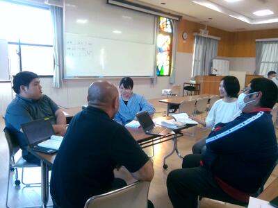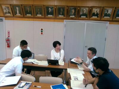 本日の研修では、探究的な学びや授業実践について改めて確認した後、各教科で実際にどのような活動を行っているかについて共有したり、今後の授業内外での活動についてアイデアを出し合ったりしました。英語科ではデータを利用した英作文の活動について、実際の教材を見ながらアイデアを出し合いました。また、国語科では「話し方」「聞き方」の領域での探究場面について話し合い、相手に応じた言葉遣いや話し方を考える活動を考えていました。