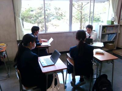 After the discussion, students talked about what kind of research they would like to start in ASⅡ classes. There were many ideas, such as making biofuel using new material, studying Amakusa pottery stones—which account for 80 percent of all pottery stones produced in Japan—, or tetrapods which dissipate waves more effectively. Some students were using the website“Amataka Scholar” to read the thesis which graduates from our school had written in high school. Others were looking for the latest information on Science researches on J-STAGE, a platform of scholarly publications in Japan. We teachers are looking forward to their creative ideas!