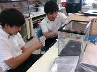 さて、地学室では、久々にヘドロ入りバケツを手にした「汽水域班」を発見しました。採取直後に測ったBOD(生物化学的酸素要求量)と、採取して1週間たったヘドロのBODを比較することで、微生物の代謝活動を調べているそうです。その後ろには、「魚糞班」が金魚の水槽から魚糞を採取しているのが見えます。また、2年生に混じって「農業班」の3年生の姿が! 2年生の生徒にアドバイスしているようです(頼もしい!)。