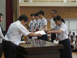 まずはじめに表彰式があり、昨年度の科学部九州大会優秀賞や、先日行われた高校総体上位入賞者(団体)が表彰されました。