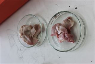 添加物をまぶした豚肉と、そうでない豚肉を加熱して比べました。
