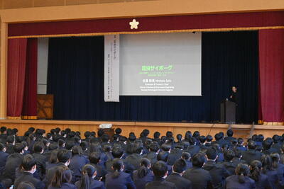 長時間の講演でしたが、生徒たちはそれぞれの進路希望と重ねあわせ、メモをとりながら真剣な眼差しで講演を聴いていました。文系・理系問わず、探究活動を行っている全ての生徒の学びとなり、将来につながる貴重な100分となったのではないかと思います。佐藤先生、本当にありがとうございました。