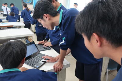 Today is the last ASⅡ class period before the ARP presentation, and all the groups are working so hard to compile their research and data. The "Fossil Group," which is preparing to give a presentation in English, is discussing and editing their English presentation slides and manuscript with William-sensei. The "Fish Manure" group is measuring the PH of the water in the eelgrass jars. They are growing eelgrass using unheated fish waste as fertilizer, and expecting that the water will become more alkalized and the eelgrass will die off in the future. The "Arm Swingers" are about to head outside, drone in hand!