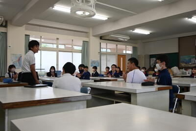 後半のグループワークでは、今日の講義で気になったワードについて4人1組で話し合いました。どの班も積極的に意見を出していました。代表で発表をしてくれた班の生徒は「天草が消滅する」というワードが気になったようで「もしそうであれば悲しい」と感想を述べてくれました。