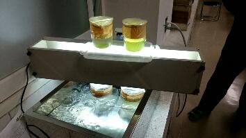 その後、写真のような装置に特定の藻を入れ、培養します。