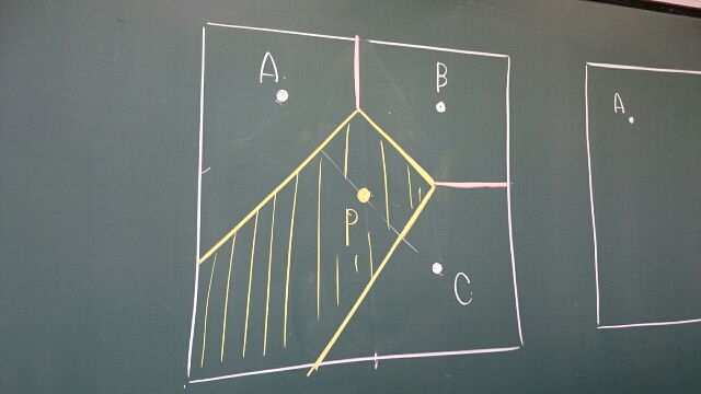 みなさんは、下にある写真(黒板)のような店A、B、Cが出店をしている地域に新しい店Pをどこに出店しますか?