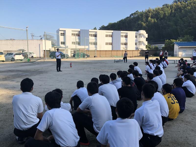 その後水消化器を用いての消火訓練を行い、天草高校教頭の石田先生から講評をいただきました。
