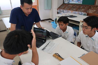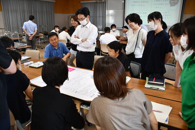 各班では夏休み中の班員それぞれの活動や先行研究の状況を確認したり、これからの研究の進め方について議論したりしていました。夏休みの期間を活用して地域の方と研究について話をしたり様々な先行研究から研究方法を練り直したりと、ある程度の活動ができた班もあれば、夏休み前とあまり状況が変わっていない班もあるようです。各班、担当の先生方に研究の方法や進め方についてアドバイスをもらいながら、これからの活動を組み立てていました。