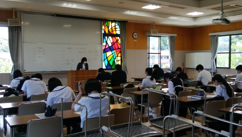 学年集会では、校長先生から、授業再開や分散登校に至るまでの熊本県の動きや、天草高校の取り組みについて説明があり、前向きに授業に臨んでほしいという激励の言葉がありました。また学年主任からは22日以降の授業の進め方について、生徒指導部からは三密を避けた校内での過ごし方に関する説明がありました。