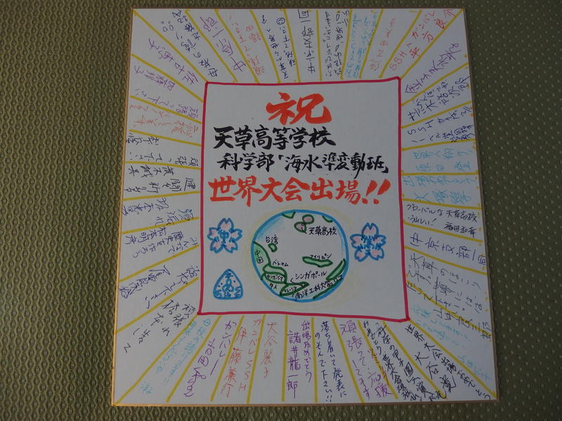 先日、同窓会中京支部総会・懇親会に出席させていただきました。遠い地にあっても同窓生が集い、毎年開催されていることに感激しました。中京支部の皆様には、母校の学習面・部活動面等での活躍ぶりを大変喜んでいただきました。また、科学部の世界大会出場に対して寄付金をいただきました。さらに、寄せ書きもいただき、「世界へ羽ばたけ」「母校の誇り」「歴史をつくろう」「応援しています」「後輩の活躍がうれしい」「ノーベル賞めざせ」「グローバルな天草高校」など、心温まる激励の言葉が書かれていました。今後も「天高で学んでよかった」と言っていただけるよう取り組んでいきたいと思います。中京支部の皆様ありがとうございました。