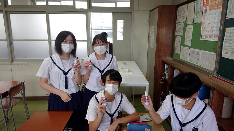 9月1日(水)、育友会から3年生全員に向けて携帯消毒液がプレゼントされました。