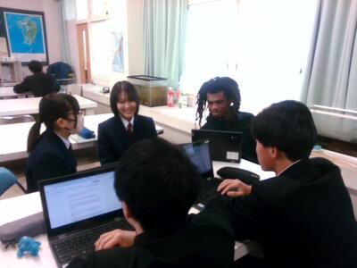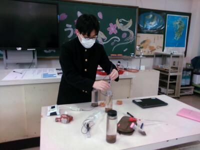 Today is the last ASⅡ class period before the ARP presentation, and all the groups are working so hard to compile their research and data. The "Fossil Group," which is preparing to give a presentation in English, is discussing and editing their English presentation slides and manuscript with William-sensei. The "Fish Manure" group is measuring the PH of the water in the eelgrass jars. They are growing eelgrass using unheated fish waste as fertilizer, and expecting that the water will become more alkalized and the eelgrass will die off in the future. The "Arm Swingers" are about to head outside, drone in hand!