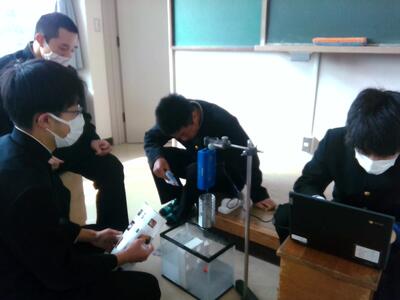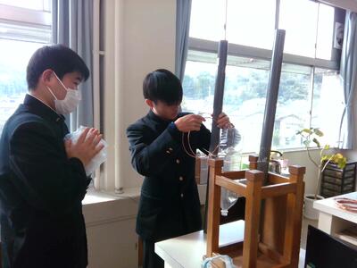 物理室にもうかがいしました。「テトラポッド」班は水槽を使って実験中です。青い装置は「力学台車」といい、バネの伸びで力を測り、計算で振れ幅(波の振幅)を求めるそうです。「ししおどし」班が制作中なのは「ししおどし3号(バネなしバージョン)」。ペットボトルの軌道を確認しながら、川での使用に耐えうるボディに仕上げていっています。両班とも楽しそうなこと!
