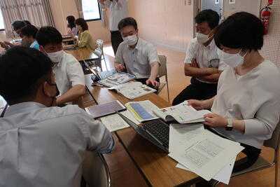 今回の研修では、生物の授業での探究場面の例を学んだ後、各教科で実際の教科書を持ち寄り、自分の教科でどのような探究場面が設定できるかを個人で考えた後、教科のメンバーで共有したり、意見交換したりしました。