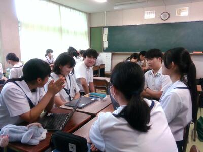 これからしばらくの期間、3年生は「提言書」、2年生は「研究計画書」の作成に取り組むことになります。授業中の様子を観察してみると、2・3年生はどちらもドキュメントを作成しているのですが、3年生には活発にディスカッションしながら活動をしている班が多い一方、2年生には静かに活動している班が多い印象です。さて、異学年交流が進むことで、この状態に変化が出てくるのでしょうか?