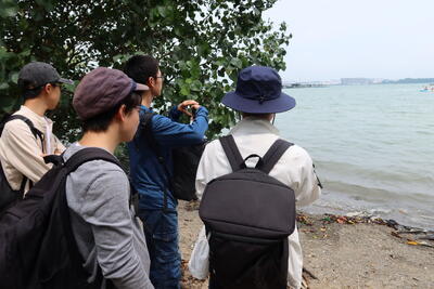 ウビン島に到着した私たちはまずシンガポール最後の村のひとつであるカンポンで昼食を取り、それから様々な動植物を観察しながら、お目当ての湿地を目指します。南国らしいカラフルな花や見たこともないような実がなっている木々などを見ながら歩くこと、約3㎞、心地よい汗をかきながら、無事目的地に到着しました。残念ながら、一番期待していたトカゲには逃げられてしまってじっくりと姿を見ることはかないませんでしたが、日本とは鳴き方の違うセミやユニークな形状の魚、聴いたことのないような鳴き声の鳥、それに猿の群れまで観察することができました。観察後は、日本で観察した白嶽湿地との土の違いや植生の違い、観察した生物などについてディスカッションを行い、ウビン島の生態系について考えを深めることができました。
