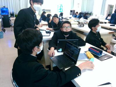 2年生の生徒が、3年生の先輩から研究の紹介や、実験方法についてのアドバイスをもらっています。
