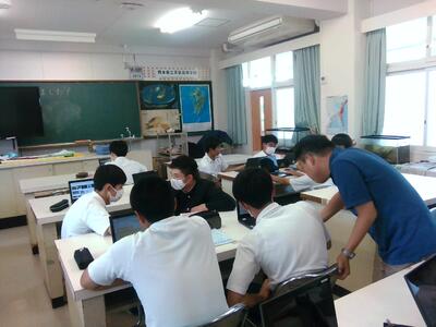 7限目にはASⅢのメンバーも加わり、地学室もますます活気づいてきました。ASⅢで行っている「魚糞」の継続研究を考えている班が先輩に助言をもらったり、「電磁誘導班」が物理室で活動している「波力発電班」の先輩に報告書を見てもらったりしています。みんなラストスパートがんばってください!