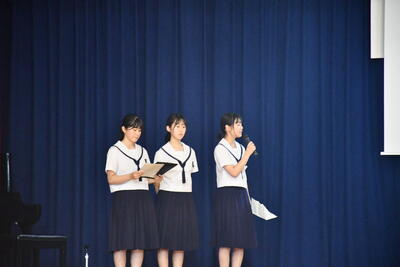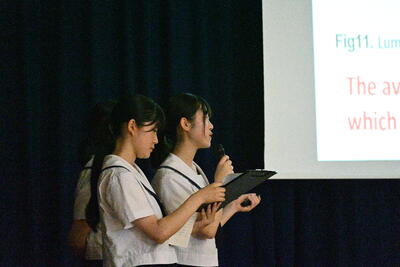 終業式後、科学部ホタル班が英語でのプレゼンテーションを全校生徒の前で行いました。世界大会での発表に向けて、これまで英語での発表練習を重ねてきました。貴重な日本のゲンジボタルについて海外の方々に知っていただくために、単に日本語を英語化するだけではなく、より伝わりやすい表現やスライドを工夫しています。英語でのプレゼンテーションならではの難しさもありますが、残りの時間で更に完成度を高め、自分たちのできるベストの発表をしてきてほしいと思います。