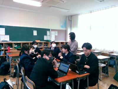 Today in AT I, each group began making posters for their presentations in preparation for the mini "Exploratory Results Presentation" scheduled for March 14. The students, who have not made posters since last year's presentation, must create graphs and tables based on the research proposal they made in October, and summarize their findings from the subsequent experiments and investigations. They realized that they did not have enough data, so they had to plan additional surveys (questionnaires), discuss whether they could formulate a hypothesis in the first place, and work on their posters at a rapid pace, as there was not much time for preparation before their presentations.