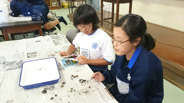 各班で採取した生物の種類を定めます。目視で大きさなどを分類し、図鑑で調べています。