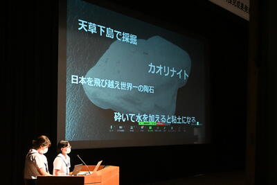 At today's presentations, 3rd graders were playing the leading role, presenting passionately what they had been up to.  On the stage, Mr. Miyazaki, the SSH Chief at Amakusa High, explained the inquiry study at our school and their achievements.  Then followed ASⅡ, ATⅡ, and Science Club presentations.  An AT presentation presented on the influence of sugar on our ability to concentrate, which interested students in need of concentration.  Another presentation done by ASⅡ students, was about Amakusa pottery stones (they have the “lion’s share” in Japan).  The presenters were fully enjoying themselves, which led the audience to an exciting Question-and-Answer session.