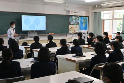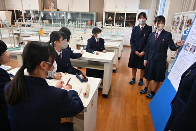 その後、3つの教室に分かれて、ASⅢの先輩方の発表を聞きました。アマモからバイオエタノールを作る研究をしている班、町山口川でマイクロプラスチックの分布を調査している班、アプリケーションを活用したイルカの個体識別を研究している班など、3年生の生徒が自分たちの研究の概要や魅力を熱心に語っていました。2年生も、積極的に質問している姿が多く見られました。