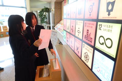 到着後、生徒たちは早速、スタッフの方々に様々な展示を案内していただきました。実際に触ったりして体験できるSDGsについての展示や、漂着ゴミで制作されたクジラのモニュメント、JICAのボランティアのことがよくわかる写真など、興味を引くものがそこここに展示してあります。特にSDGsは授業で扱った内容ということもあり、多くの生徒たちの興味を引いたようです。ホールにある世界地図で、今日お会いする研修員の方の出身国、セルビアの場所を確認している生徒もいました。(みなさんはセルビアがどこにあるか知っていますか?)