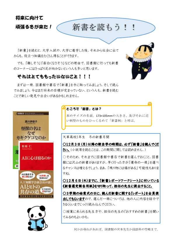 1学年では、本日から1カ月間を「新書月間」とし、朝読書の時間に全員が新書を読みます。