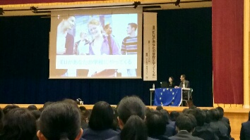 11月16日(金)に天草高校体育館で、「EU(欧州連合)があなたの学校にやってくる」の出張授業が実施され、全校生徒で受講しました。