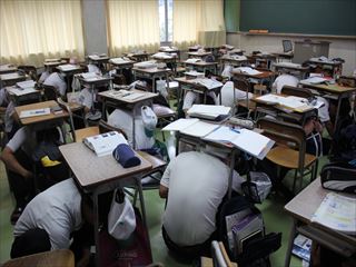 避難訓練終了後は、各クラスで、担任の先生からの講話があり、隈部先生は、熊本地震の経験をもとにお話をされていました。