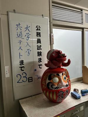 進路指導室前のオクトパス(置くとパス)くんとダルマも受験生の奮闘を応援しています。