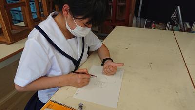 男子部員は、生物図鑑の写真をもとに「カイセンシオマネキ」のデッサンに熱中していました。