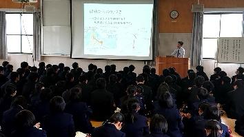 課題研究アドバイザーの宮崎先生から、課題研究をする際に大事なことや、身に付けてほしい資質.能力について学びました。